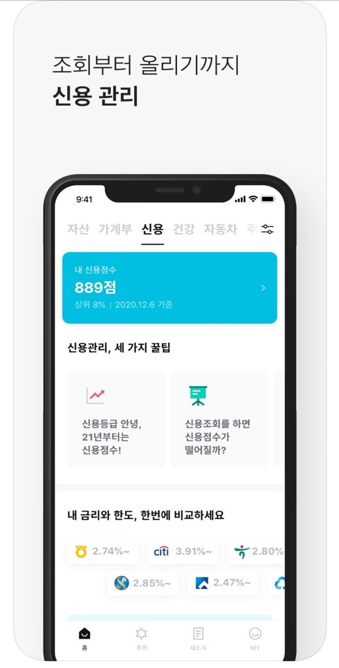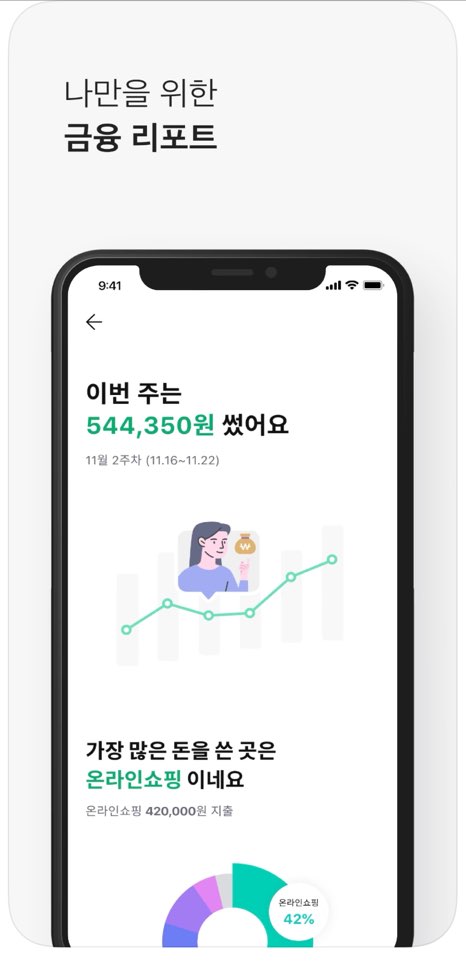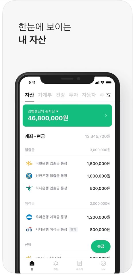 - 계좌, 현금, 카드, 보험, 투자, 대출, 연금, 자동차, 부동산, 신용까지 하나의 어플로 확인