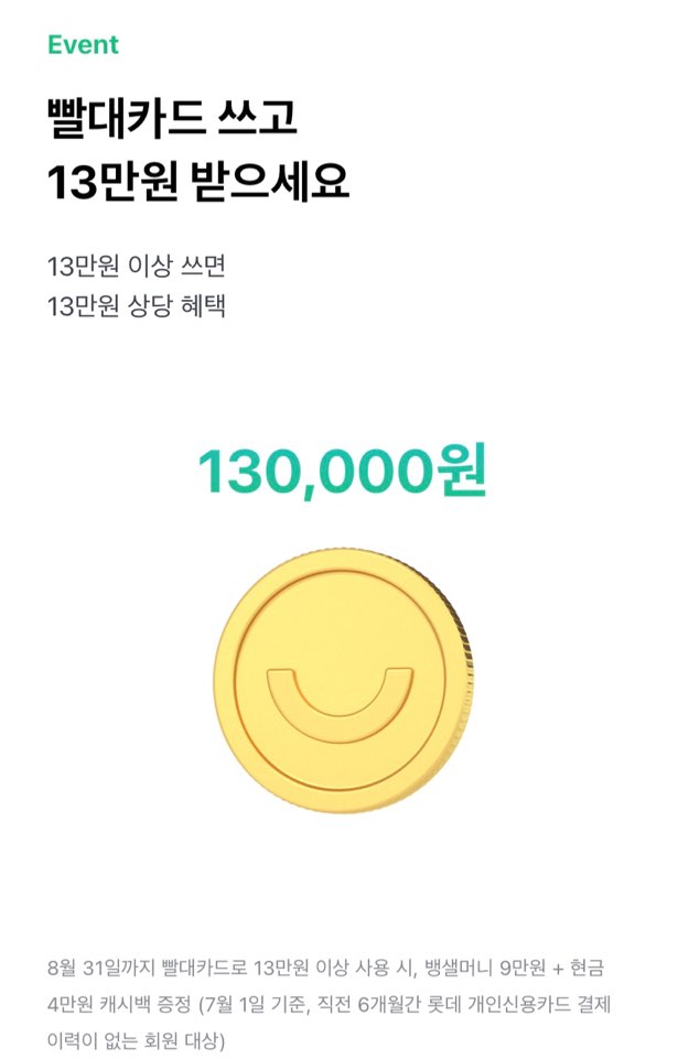 - 21년 8월 31일까지 빨대 카드로 13만 원 이상 사용 시 뱅 샐머니 9만 원 + 현금 4만 원 캐시백 증정!