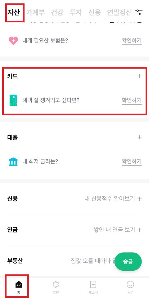 ▷ 뱅크 샐러드 홈 > 자산 > 카드 > 확인하기