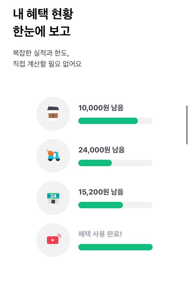 - 1회성 일반구매 결제 및 통신요금 내 합산 청구, 앱 마켓(구글 플레이/앱스토어) 결제와 같이 가맹점 구분이 불가한 경우에는 혜택 미제공.